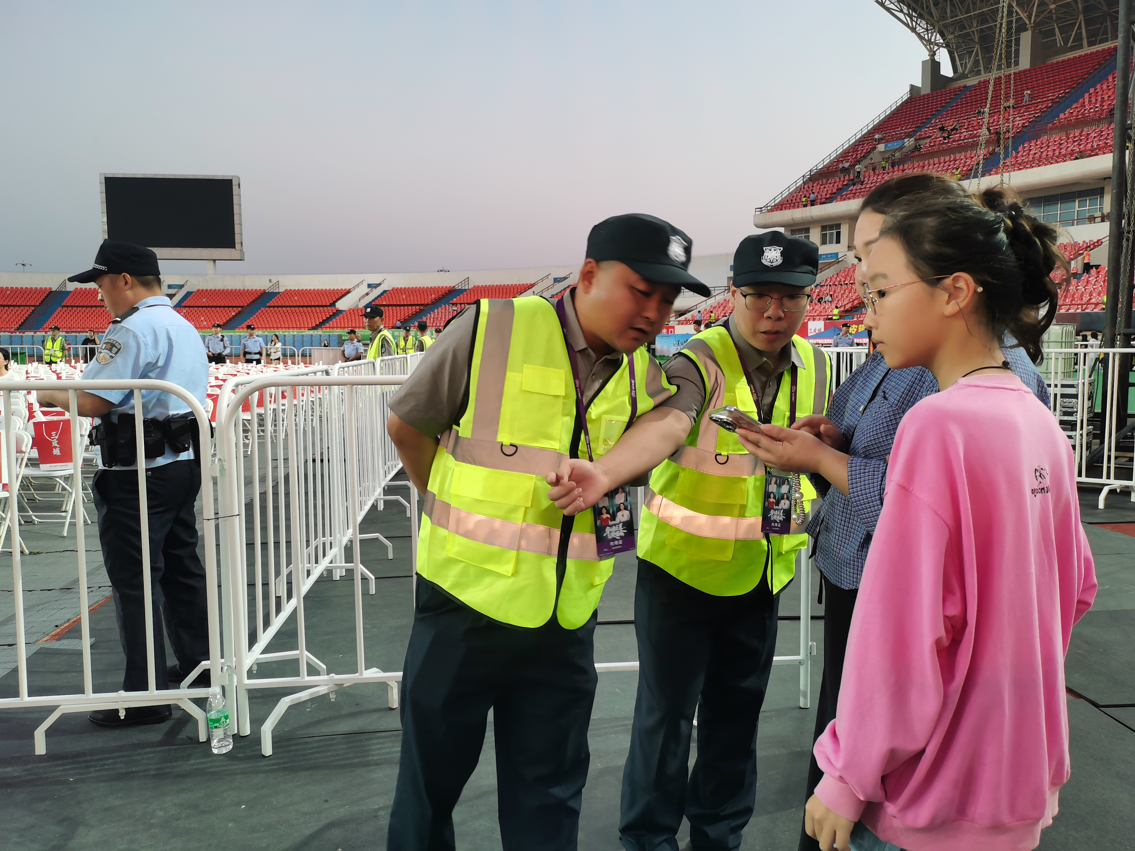 在入口處,隊(duì)員們麻利操作安檢儀,目光專注核查入場憑證,對(duì)觀眾攜帶的違規(guī)物品嚴(yán)格管控。內(nèi)場里,巡邏隊(duì)員的腳步從未停歇,他們始終面向觀眾站立,雙眼緊盯場內(nèi)動(dòng)態(tài):看見觀眾情緒高漲站立觀看,立刻溫和勸阻;遇人找不到座位、尋求幫助,馬上上前指引。